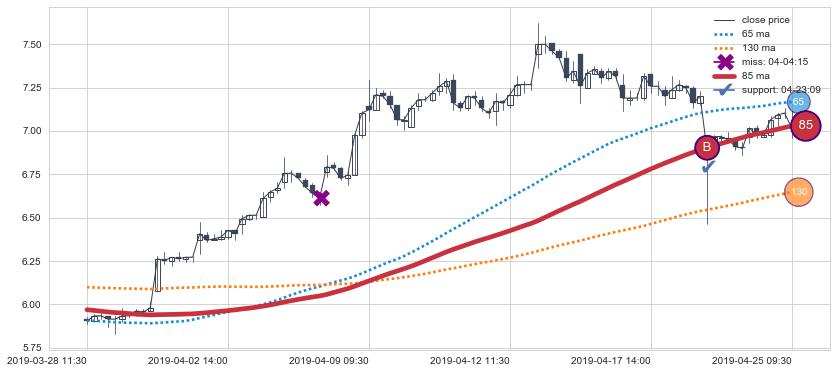 上涨趋势03-28 11:30-04-25 09:30,均线85确认关键支撑1处
