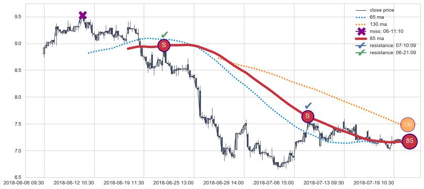 下跌趋势06-06 09:30-07-19 15:00,均线85确认关键阻力2处