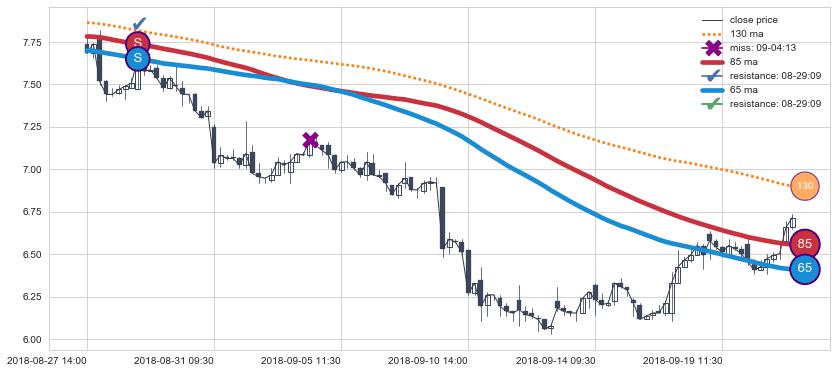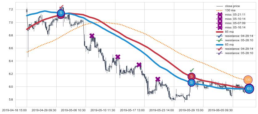 下跌趋势04-18 15:00-06-06 14:00,均线65, 85确认关键阻力2处