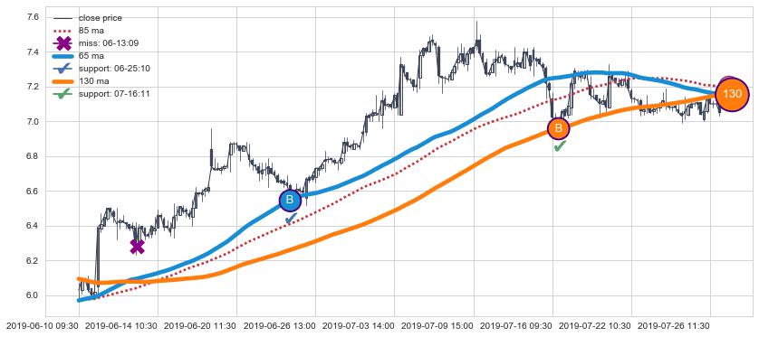 上涨趋势06-10 09:30-07-26 15:00,均线65, 130确认关键支撑2处