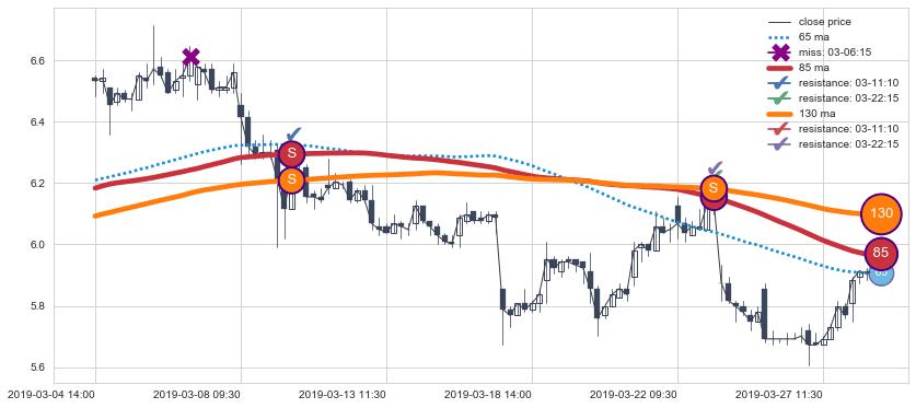 下跌趋势03-04 14:00-03-28 11:30,均线130, 85确认关键阻力2处