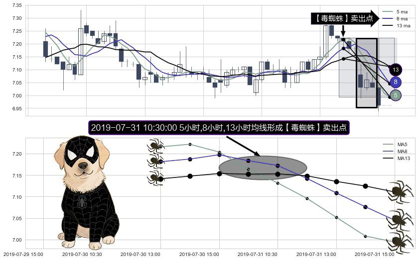 形态多维评估: ⚀ 2019-07-31 10:30:00小时显现 5小时-8小时-13小时均线 【毒蜘蛛】卖出点 看空信号,后市看跌,卖出