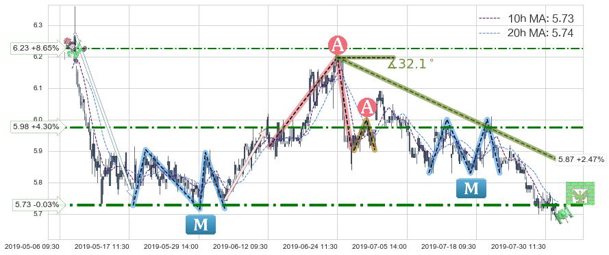 ♘ 阻力价格位5.98,可信任强度69.42%,距离最后交易2019-07-31 15:00形成的收盘价格5.73相差 +4.30%