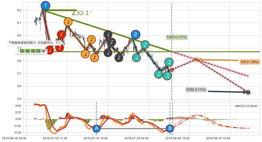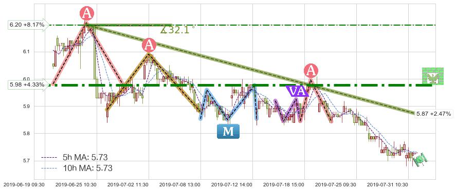 ➢ 预测:2019-08-07 15:00,【小幅反弹】稳定目前下跌趋势的前提下,预测价格:5.81