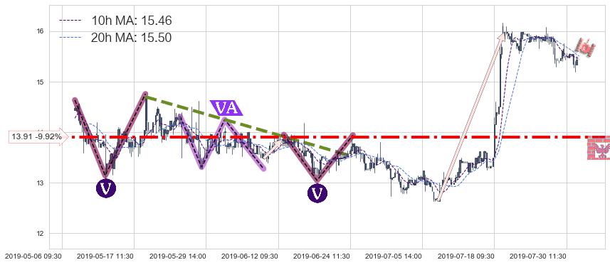 2019-05-15: 时域附近第一支撑位13.91持续的对上升趋势进行阻拦,有效放缓了上涨的速度。