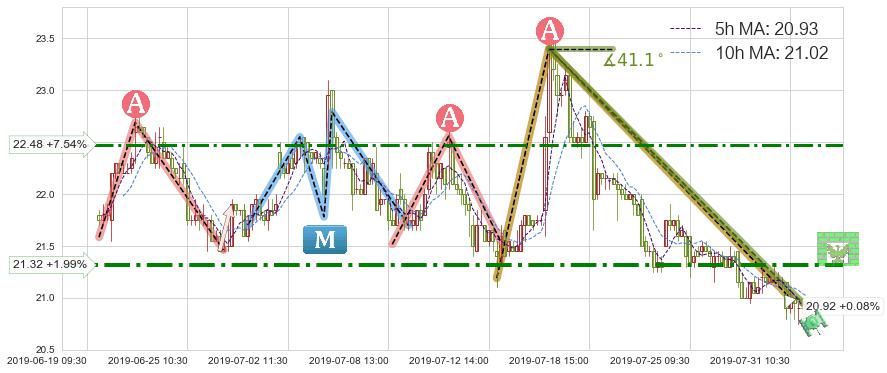 🦴 长线均值回复组合短线趋势跟踪[强阻力信号]2019-07-17 10:30-2019-07-31 14:00下跌趋势依然成立(下跌趋势跟踪依然存在),短线价格略微上行反弹(均值回复猜想),即将接近下跌趋势提供的未破位阻力价格:20.92。