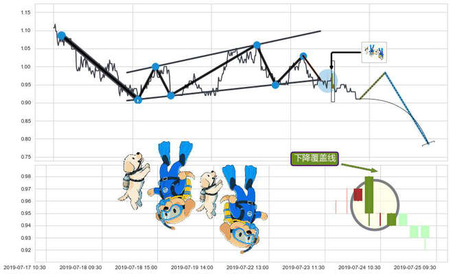 ➢ 🕰 价格走势在2019-07-23 15:00:00至2019-07-24 11:30:00期间形成下降覆盖线,残存影响值:-6.01