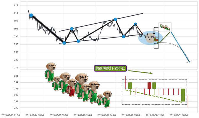 ➢ 🕰 价格走势在2019-07-29 09:30:00至2019-07-31 09:30:00期间形成绵绵阴跌|下跌不止,残存影响值:-9.38
