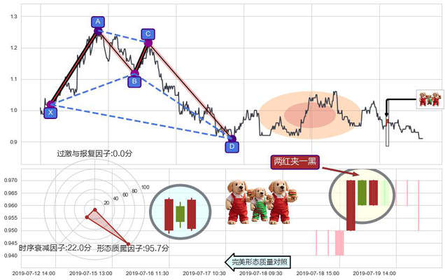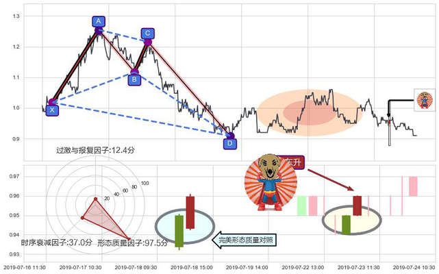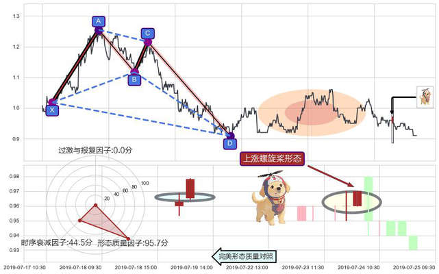 ➢ 上涨螺旋桨形态 + 谐波螃蟹d拐点上涨支撑信号叠加后【反向回撤率】偏高,【看多】信号叠加【存续影响降权】
