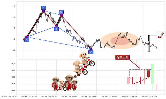 ➢ 谐波螃蟹:c下跌到达d:猜想拉升 → 上涨 →【拐点】强支撑临近 → 大趋势均值回复