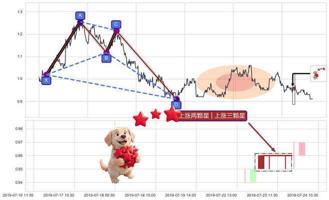 ➢ 🕰 价格走势在2019-07-23 09:30:00至2019-07-23 13:00:00期间形成上涨两颗星 | 上涨三颗星,残存影响值:1.38