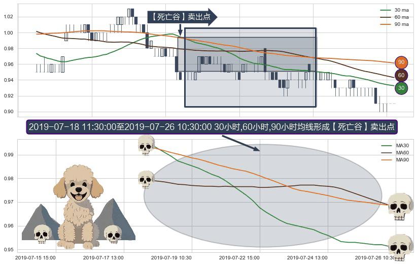 形态多维评估: ⚀ 2019-07-18 13:00:00-小时至2019-07-26 10:30:00-小时显现 30小时-60小时-90小时均线 【死亡谷】卖出点 看空信号,后市看跌,卖出