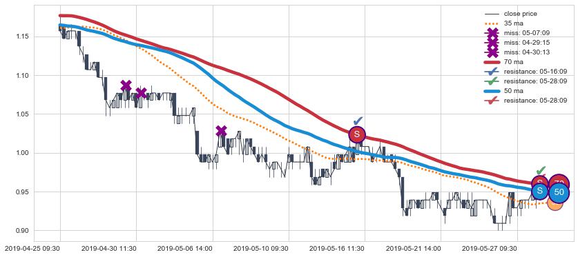 下跌趋势04-25 09:30-05-28 11:30,均线50, 70确认关键阻力2处