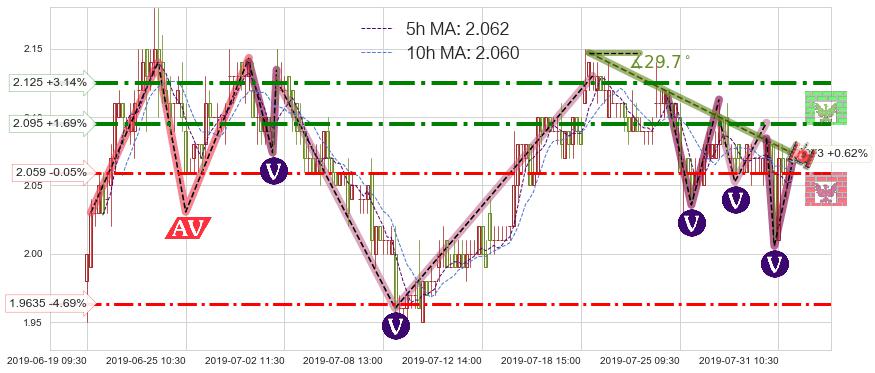 ➢ 预测:2019-08-01 12:00,【小幅反弹】稳定目前下跌趋势的前提下,预测价格:2.069
