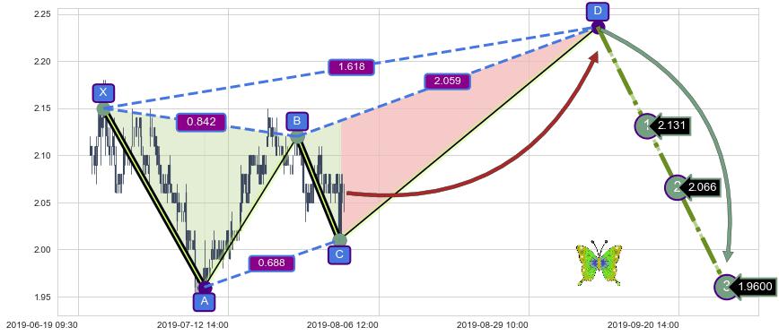 ➣ 未完成【蝴蝶】形态起点X: 06-21:15, 已到达C点: 07-31:09, 预测最终D点: 09-09:14, 共326交易小时