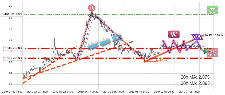 ♘ 支撑价格位2.845,可信任强度87.69%,距离最后交易2019-07-31 15:00形成的收盘价格2.870相差 -0.86%