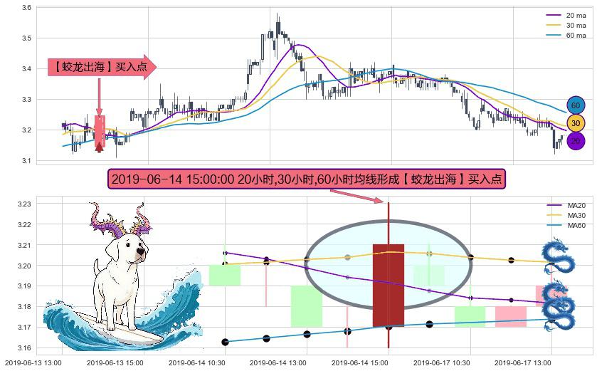 形态多维评估: ⚀ 2019-06-14 15:00:00小时显现 20小时-30小时-60小时均线 【蛟龙出海】买入点 看多信号,后市看涨,买入