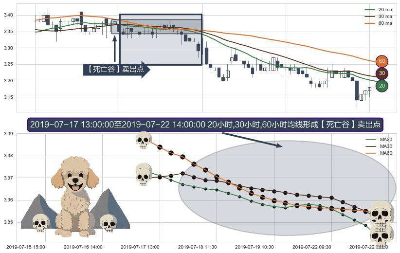 形态多维评估: ⚀ 2019-07-17 14:00:00-小时至2019-07-22 14:00:00-小时显现 20小时-30小时-60小时均线 【死亡谷】卖出点 看空信号,后市看跌,卖出