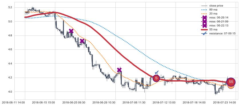 下跌趋势06-11 14:00-07-23 14:00,均线55确认关键阻力1处