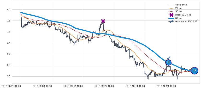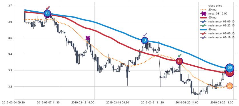 下跌趋势03-04 09:30-03-29 11:30,均线89, 55确认关键阻力3处