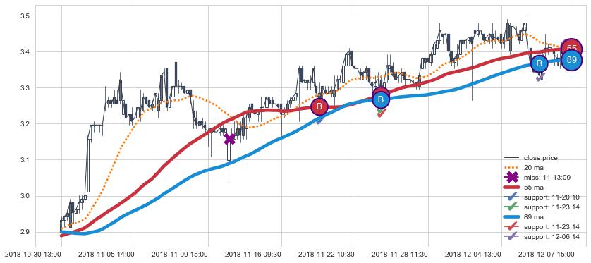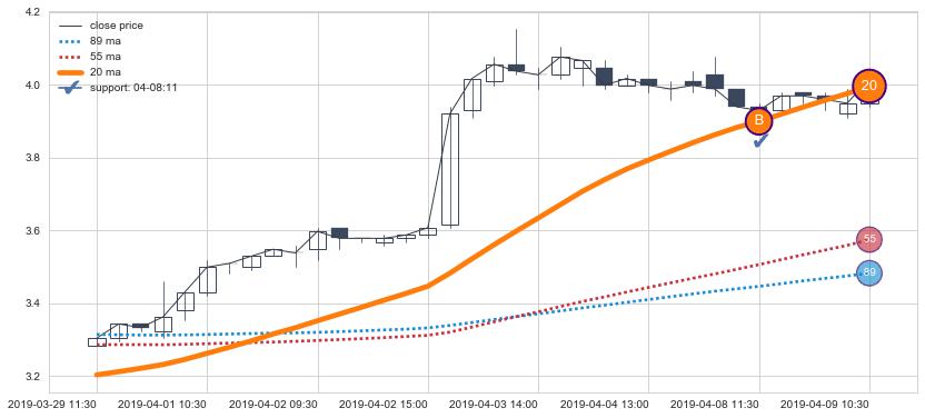 上涨趋势06-18 15:00-07-08 11:30,均线89, 20, 55确认关键支撑2处