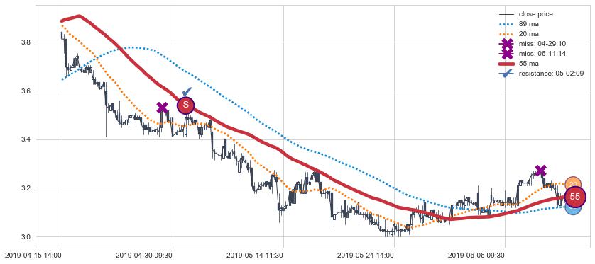 下跌趋势04-15 14:00-06-13 13:00,均线55确认关键阻力1处