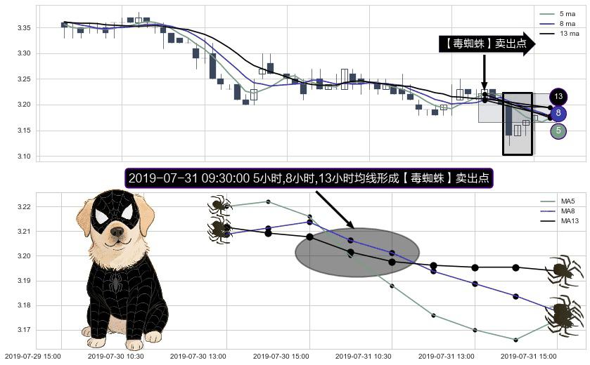 形态多维评估: ⚀ 2019-07-31 09:30:00小时显现 5小时-8小时-13小时均线 【毒蜘蛛】卖出点 看空信号,后市看跌,卖出