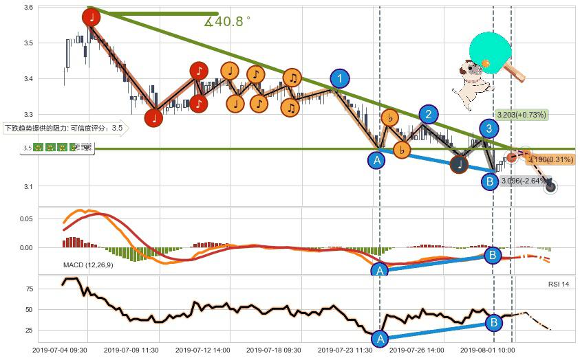 ➣ 预测:2019-08-02 14:00,【继续下探】稳定目前下跌趋势的前提下,预测价格:3.096