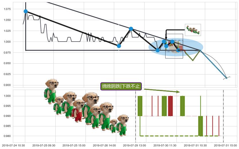 从2019-07-26 10:30至2019-07-31 15:00,共包含23个小时,阶段股价上涨0.03%,阶段股价变动位移路程比: 1 : 198