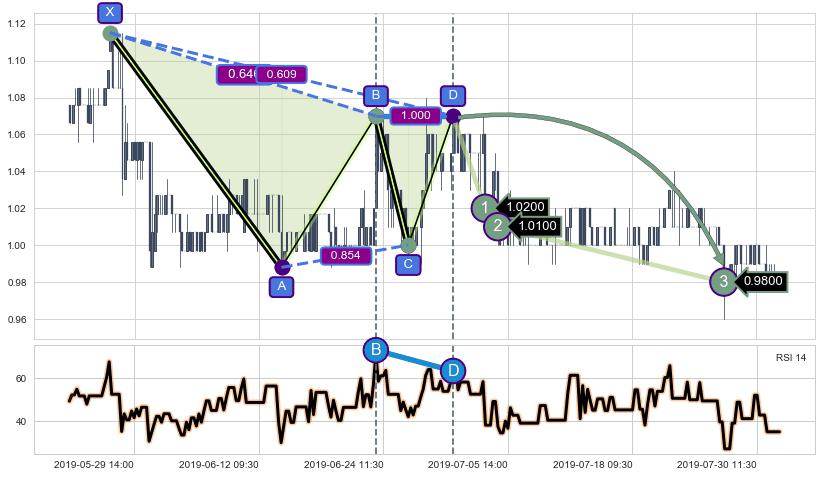 ➢ 谐波价格D点比B点高 ⤴,【RSI】指标D点比B点低 ⤵️