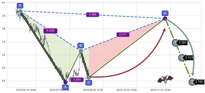 ➢ 距离预测D点位置有足够的上涨空间, 与看跌【蝙蝠】形态相反,实际方向【看涨】