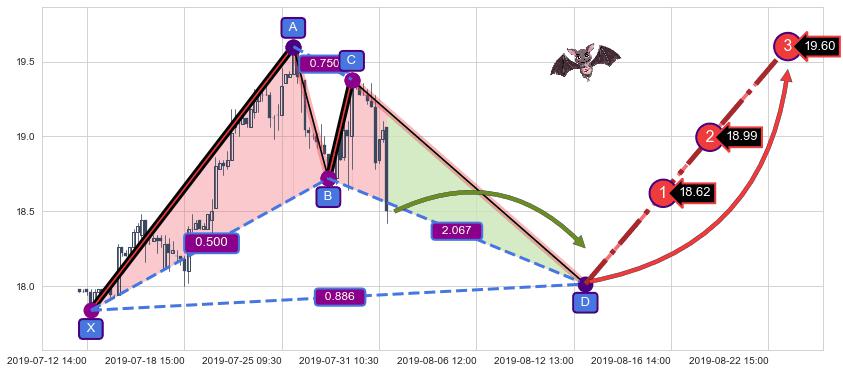 ➣ 未完成【蝙蝠】形态起点X: 07-12:15, 已到达C点: 07-30:09, 预测最终D点: 08-13:10, 共126交易小时