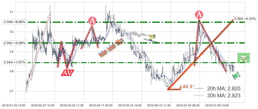 ♘ 阻力价格位2.942,可信任强度73.86%,距离最后交易2019-07-31 15:00形成的收盘价格2.800相差 +5.08%