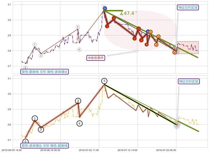 从2019-07-03 13:00至2019-07-25 11:30,共包含96个小时,阶段股价下跌-8.75%,阶段股价变动位移路程比: 1 : 3,下跌趋势角度: 47.4