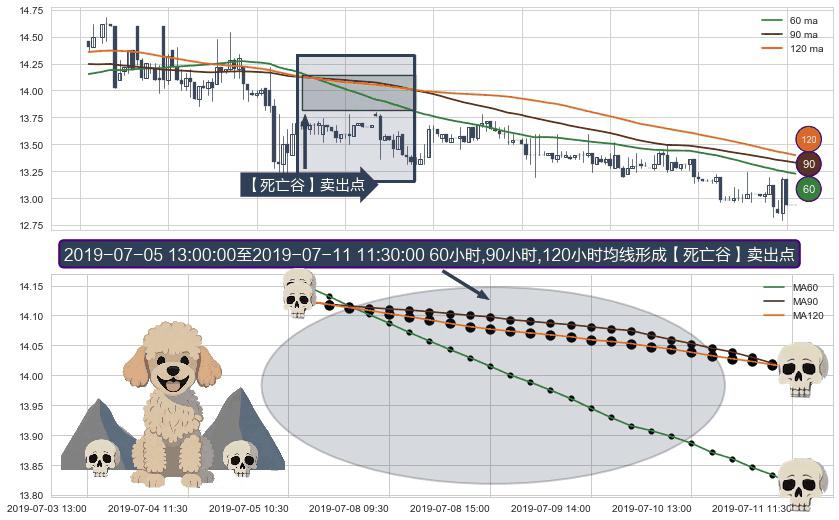形态多维评估: ⚀ 2019-07-05 14:00:00-小时至2019-07-11 11:30:00-小时显现 60小时-90小时-120小时均线 【死亡谷】卖出点 看空信号,后市看跌,卖出