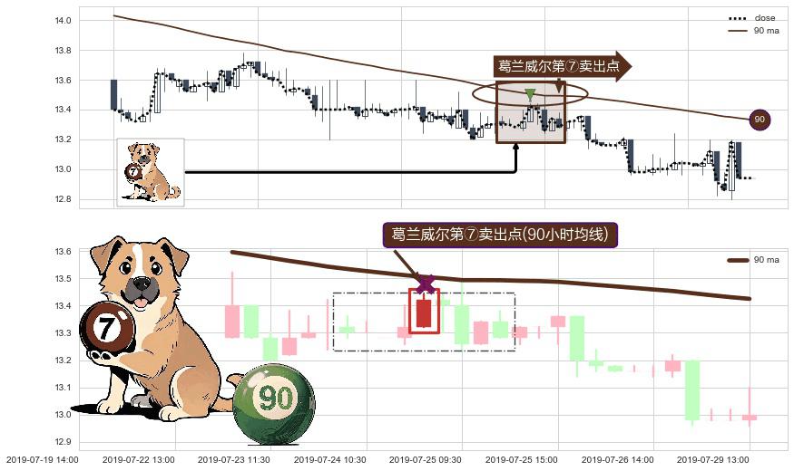 形态多维评估: ⚀ 2019-07-24 14:00:00-小时显现 葛兰威尔均线 90小时均线 第⑦卖出点 下降趋势的中继信号,后市看跌,卖出信号
