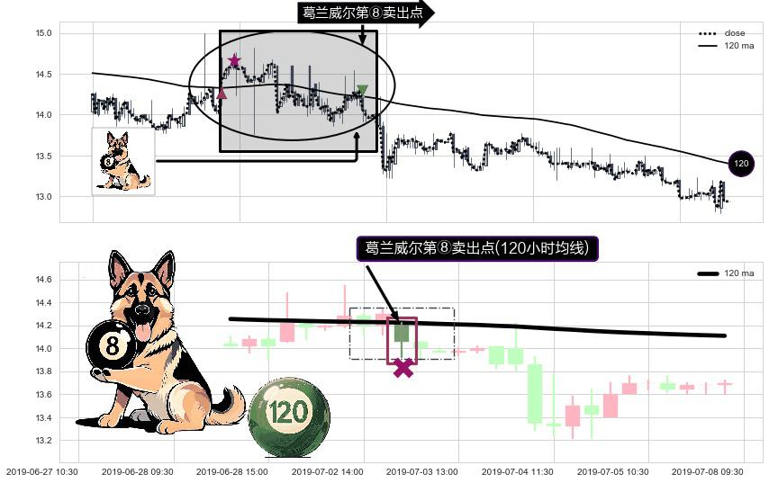 形态多维评估: ⚀ 2019-07-03 09:30:00-小时显现 葛兰威尔均线 120小时均线 第⑧卖出点 下降趋势的中继信号,后市看跌,卖出信号