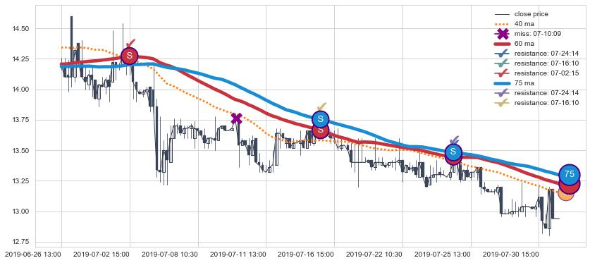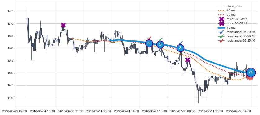 下跌趋势05-29 09:30-07-16 14:00,均线75确认关键阻力3处