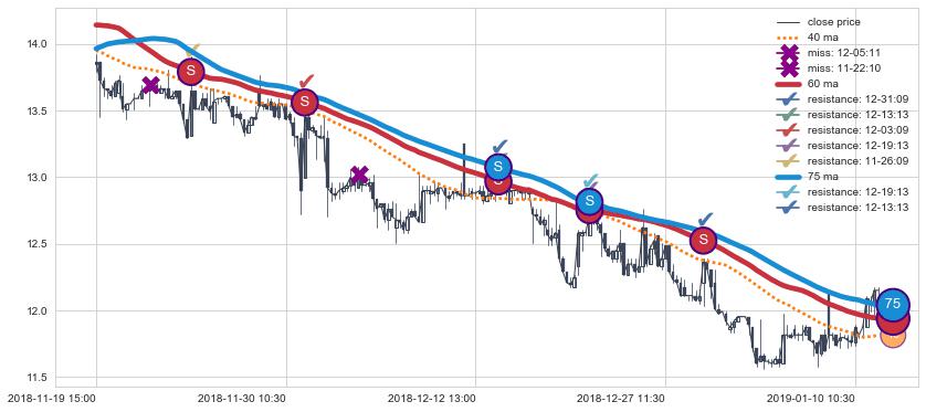 下跌趋势11-19 15:00-01-11 10:30,均线75, 60确认关键阻力5处