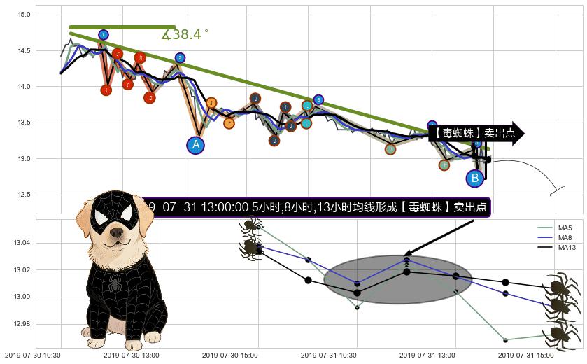 从2019-06-20 14:00至2019-07-31 10:30,共包含166个小时,阶段股价下跌-12.66%,阶段股价变动位移路程比: 1 : 5,下跌趋势角度: 38.4