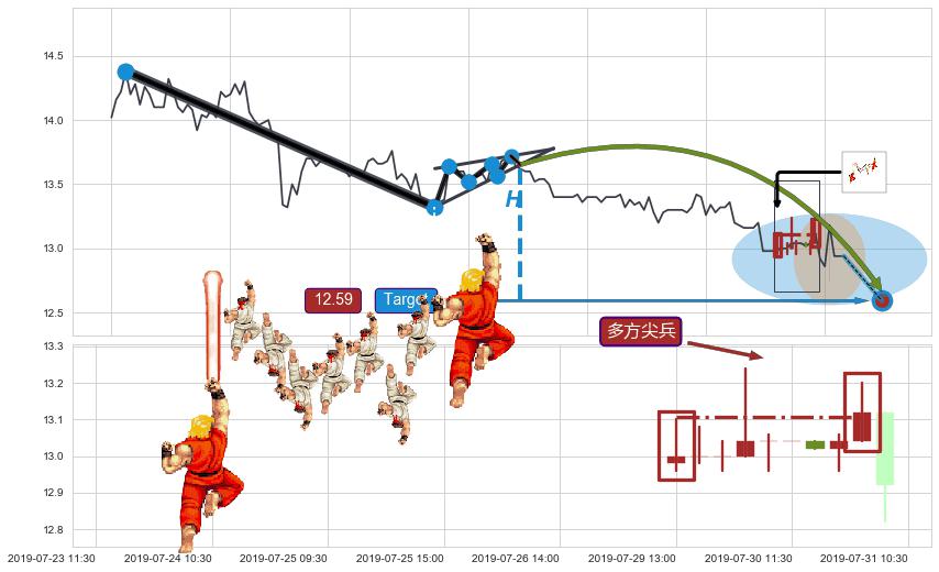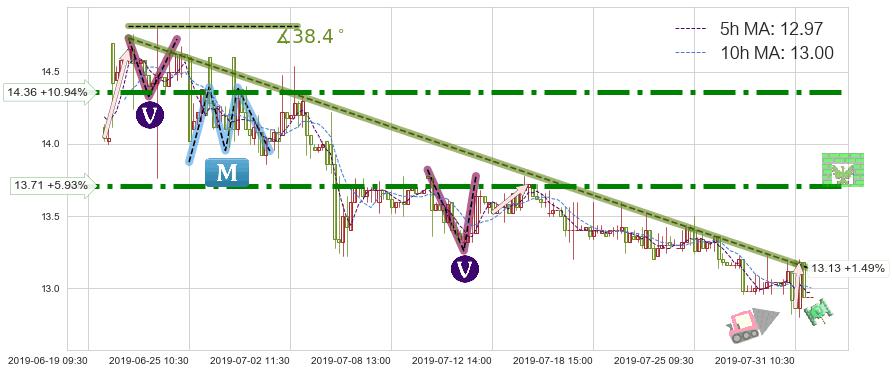 ➣ 预测:2019-08-06 12:00,【试探阻力】稳定目前下跌趋势的前提下,预测价格:12.93