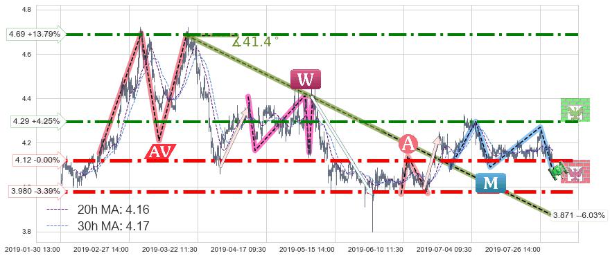 ➣ 【已确认突破】最后价格:4.12与最小【整理】第一目标价格→(08-12:13: 3.707 )相较: 下跌空间【中等】