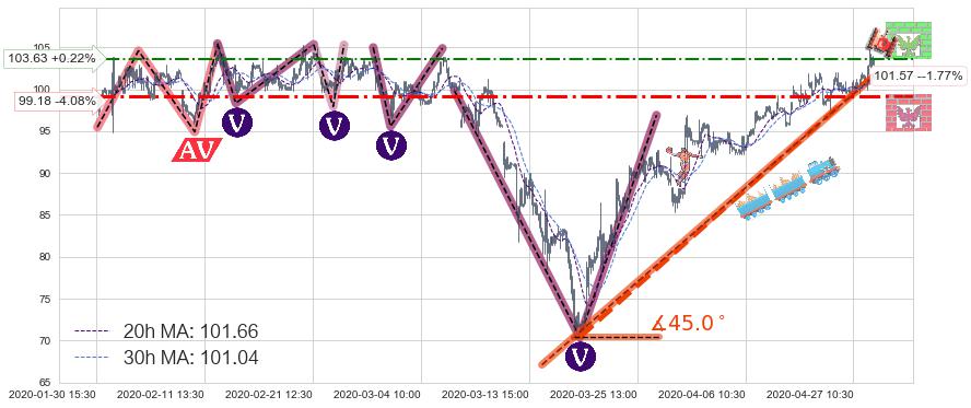 🍖 长线趋势跟踪组合短线均值回复[强支撑信号]2020-03-16 14:30-2020-04-29 15:30上升趋势依然成立(上涨趋势跟踪依然可行),短线价格略微下行回调(均值回复猜想),即将接近趋势提供的未破位的支撑价格:101.57。