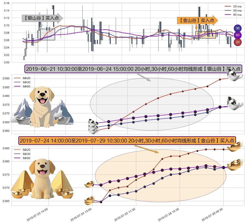 ⚀ 2019-07-24 15:00:00-小时至2019-07-29 10:30:00-小时显现 20小时-30小时-60小时均线 【金山谷】买入点 其再次确认了买入信号,可靠性更强,买入