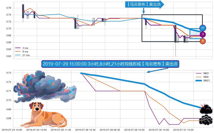 形态多维评估: ⚀ 2019-07-25 14:00:00小时-2019-07-31 15:00:00小时显现 3小时-8小时-21小时均线 【乌云密布】卖出点 看空信号,后市看跌,卖出