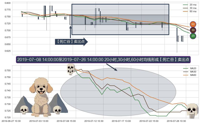 形态多维评估: ⚀ 2019-07-08 15:00:00-小时至2019-07-26 14:00:00-小时显现 20小时-30小时-60小时均线 【死亡谷】卖出点 看空信号,后市看跌,卖出