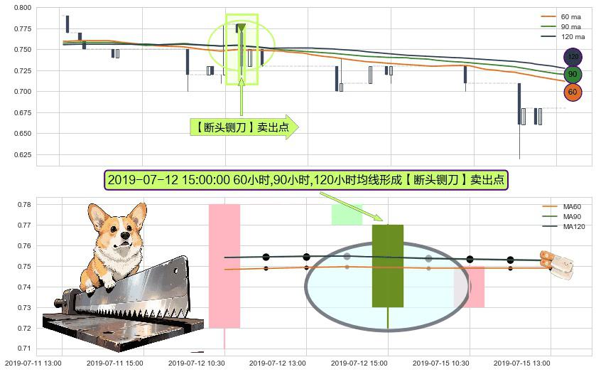形态多维评估: ⚀ 2019-07-12 15:00:00小时显现 60小时-90小时-120小时均线 【断头铡刀】卖出点 看空信号,后市看跌,卖出
