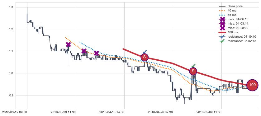 下跌趋势03-19 09:30-05-15 15:00,均线100确认关键阻力2处