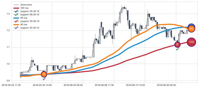 上涨趋势05-25 11:30-06-21 11:30,均线40, 100, 55确认关键支撑2处