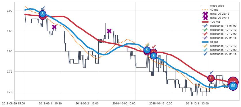 下跌趋势08-29 15:00-11-07 09:30,均线100, 55确认关键阻力4处